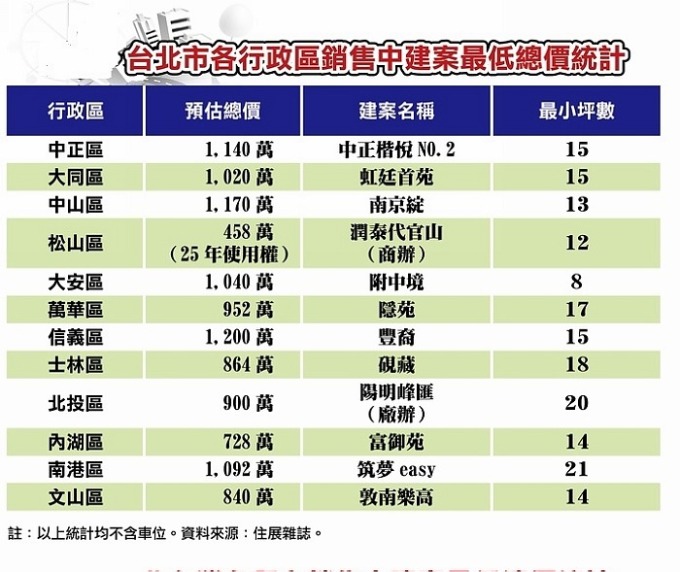據統計,台北市 12 個行政區線上銷售中的新建案,每個行政區都有 1200 萬元以下的低總價產品。其中,總價門檻相對高的是信義區,最低門檻約 1200 萬;門檻最低的是松山區,僅需 458 萬。但若扣除地上權、使用權產品,則門檻最低的是內湖區,入手價約 728 萬元。