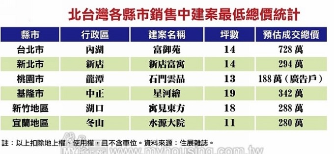 與台北市房價相比,北台灣其他縣市房價顯得更加親民。住展雜誌另統計,北台灣各縣市銷售中建案的最低總價,發現除北市外,各縣市最低總價均落在 1 百多到 3 百多萬,尤以桃園龍潭「石門雲品」總價最低,13 坪房型廣告戶僅需 188 萬元。