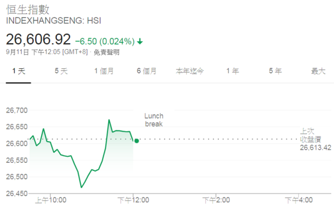 恒生指數今 (11) 日低開 0.01%,之後走勢震盪,截止午間收盤,恒生指數跌 0.02%,報 26606.92 點。國企指數跌 0.33%,報 10399.55 點;紅籌指數跌 0.49%,報 4194.83 點。大盤成交量港幣 453.72 億元。
