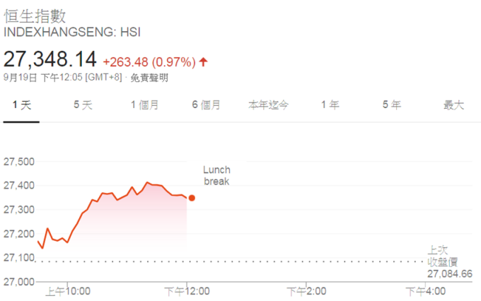 恒生指數今 (19) 日高開 0.32%,隨後漲幅擴大,截止午間收盤,恒生指數漲 0.97%,報 27348.14 點。國企指數漲 1.5%,報 10715.56 點;紅籌指數漲 1.19%,報 4350.09 點。