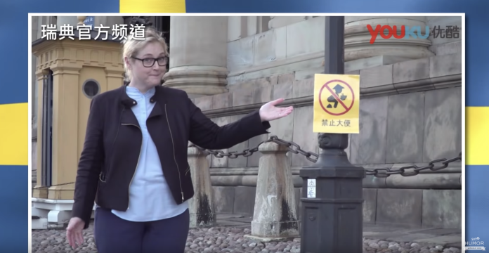 瑞典電視台 21 日在《瑞典新聞》( Svenska nyheter )娛樂節目中,播出長達一分半的「宣傳影片」,引發爭議。影片中女主播微笑「提醒」陸客不能隨地大小便、如廁後要記得洗手,甚至稱大陸人是種族主義者。對此,中國大陸政府嚴正抗議此辱華行為,要求電視台發出道歉。