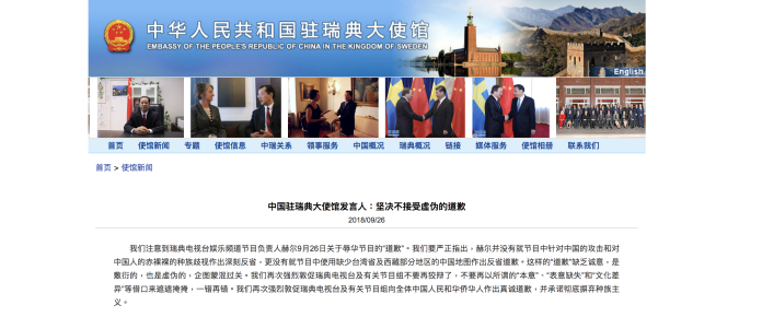 瑞典電視台雖「連續道歉」,但從一開始的拒絕道歉,到「向感到被冒犯的個人道歉」,再改為「向在中國和瑞典感到被傷害的個人道歉」。中共駐瑞典大使館表示,這些都是極不嚴肅、不真誠,始終「迴避排華辱華的本質」試圖造成人民與政府的對立,用心極其險惡。