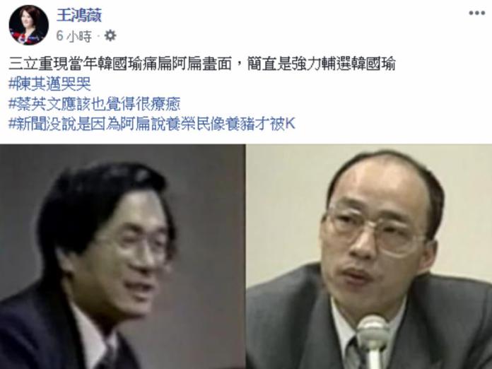 國民黨文傳會副主委的王鴻薇今( 2 )日也在臉書表示,媒體重現當年韓國瑜痛扁阿扁的畫面,簡直是「強力輔選韓國瑜」,她還 hashtag 「陳其邁哭哭」、「蔡英文應該也覺得很療癒」、「新聞沒說是因為阿扁說養榮民像養豬才被 K 」。