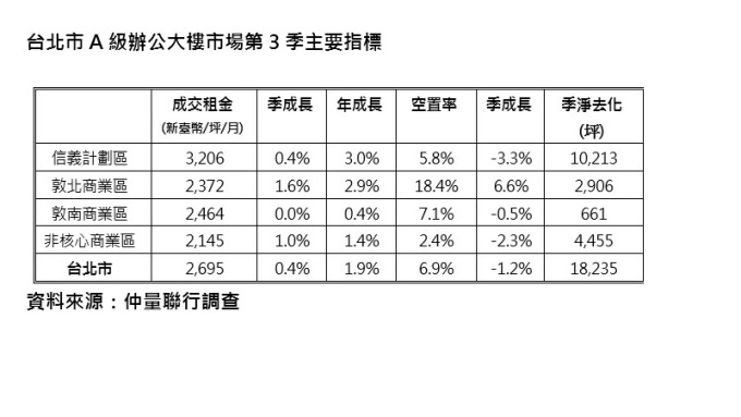 在新釋出供給持續吸引原 A 辦或其他等級大樓的租戶外,仲量聯行指出,第 3 季有租戶因併購進行辦公室統合以及原租戶進行中大坪數增租。整體空置率方面,雖然敦北商業區有大樓釋出,但空間去化動能高,第 3 季其他商業區空置率連帶持續下降,令整體空置率較上季下降 1.2 個百分點,來到 6.9%。其中信義區空置率下降至 5.8%,非核心商業區更來到 2.4%,已接近滿租狀態。