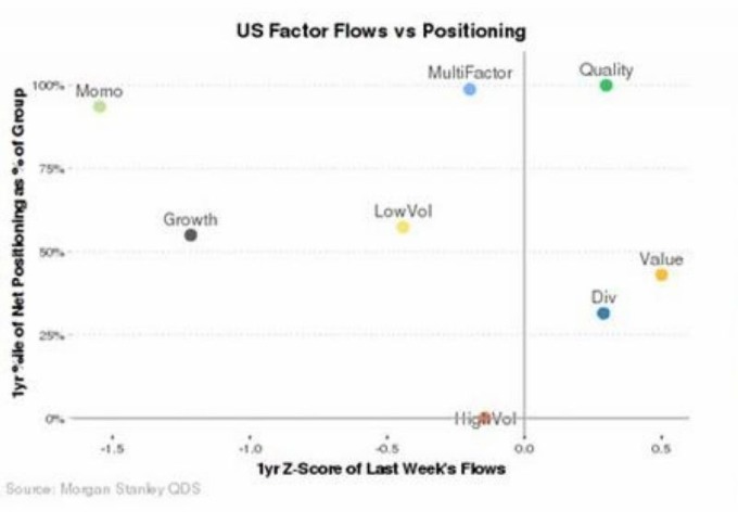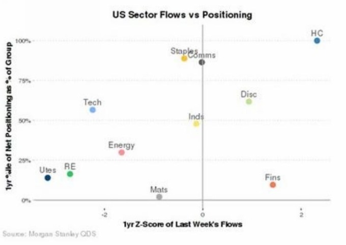 各資產 ETF 資金流向變化 (直線標準分數 Z-Score 計) 圖片來源:Morgan Stanley 但是令是場意外的是,在當前美股科技股廣遭拋售的環境下,事實上資金並未進入到所謂的「防禦性類股」,似乎美股投資人在拋售科技股之後,仍對市場其他版快持著較為觀望之態度。