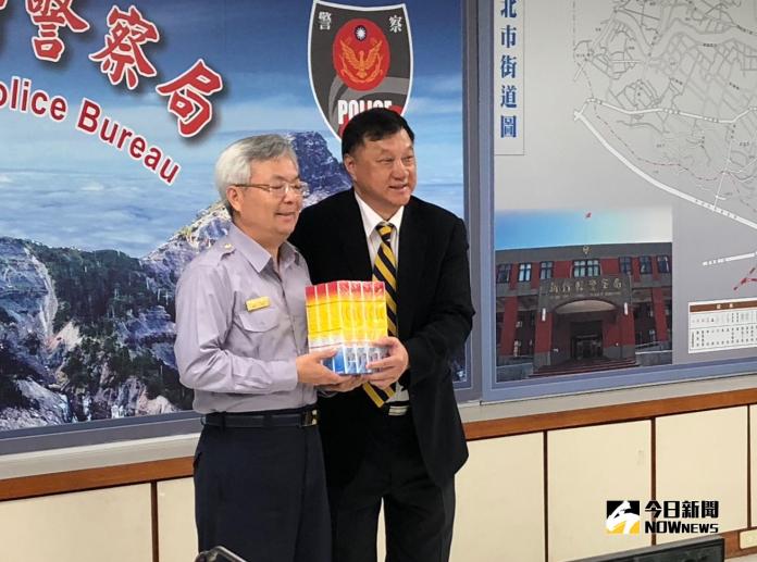 ▲企業家范育俊(右)捐贈5千瓶消炎液,新竹縣警察局長張榮興(左)表示感謝。(圖/記者誾宣震攝,2018.10.17)