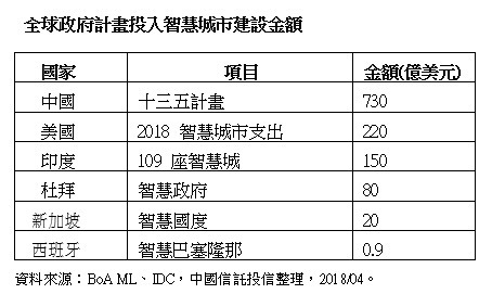 中國信託智慧城市建設基金經理人劉哲維表示,各國競相投入城市改造,包括美國、中國、印度、新加坡、杜拜、西班牙等等,這些國家預計投入數億美元的經費打造智慧國度,預估未來 10 年,全球基建投資將達 71~78 兆美元 (資料來源:美林美銀,2018/04), 智慧城市建設前景無可限量。