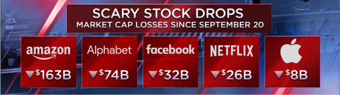 大型科技股,尤其是 FANG 股 (臉書、亞馬遜、Netflix 和谷歌母公司 Alphabet) 受創最嚴重,亞馬遜本月跌幅 20.2%,Netflix 也跌了 19.3% 之多,均在公布財報後嚇跑投資者。臉書和 Alphabet 本月分別下跌 7.7% 和 9.7%。