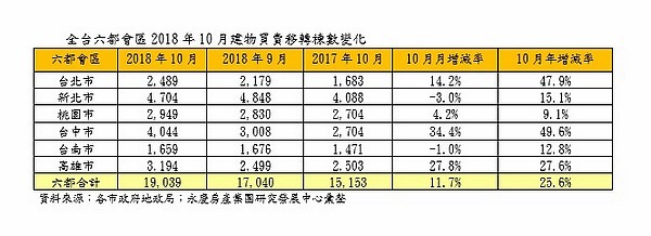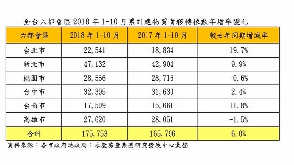 同時,曾敬德表示,從累計到 10 月的全台六都房屋買賣移轉戶數推估,2018 年全台的買賣移轉戶數應會落在 28 萬戶上下,房市交易量連續兩年反彈回溫。