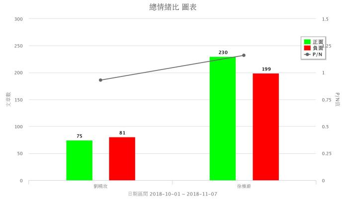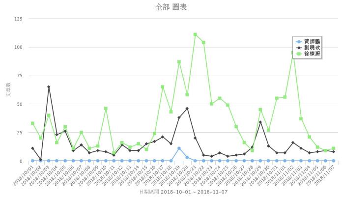 根據網路分析平台 Quickseek 的「網路聲量」趨勢分析圖可見,自 10 月 1 日至 11 月 7 日為止,由於花蓮的選情討論熱度較低,3 名參選人的網路聲量相較於其他縣市的參選人低很多,聲量最高的徐榛蔚,總聲量數也僅 1374 則、單日最高討論度更只有 111 則。至於劉曉玫的總聲量數更是直接減半,只有 545 則,單日最高討論度為 65 則;黃師彭則幾乎沒有討論度,整個 10 月份總計只有 14 則。