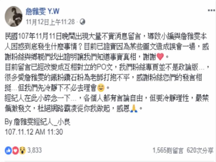 日前歌手詹雅雯參加民進黨高雄市長候選人陳其邁旗山造勢活動,她只不過在台上喊了一聲「凍蒜」,粉絲頁就被網友灌爆,留言區完全變成政論版,形成網路霸凌,不理智的網友留言「挺威權的一方永遠是跟人民站在對立面!」、「不當你粉絲了 抱歉」。