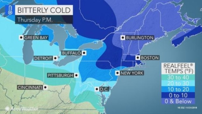 據天氣情報網站 AccuWeather 數據顯示,來自北極的強勁暴風雪正猛烈侵襲北美東部地區,如週四 (22 日) 感恩節早晨,新英格蘭北部地區溫度一度低至攝氏零下 18 度 C,維吉尼亞州東南部氣溫亦來到零下 1 度 C,創下逾百年罕見的現象。
