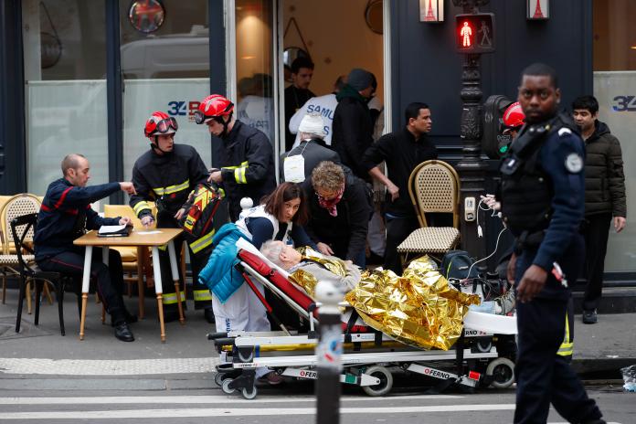 巴黎大爆炸現場,消防及醫護人員將傷者緊急送醫。(圖/美聯社/達志影像)