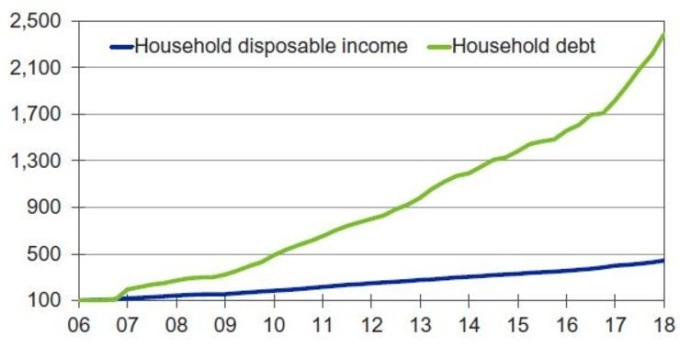 穆迪分析 (Moody’s Analytics) 的經濟學家去年 12 月指出,中國可支配收入過去 6 年以平均年率 10% 成長,但家庭債務 (大多數都是房貸) 卻以平均年率 20% 的速度增長,單就過去一年,家庭債務成長的平均速度就已攀升至 26%。