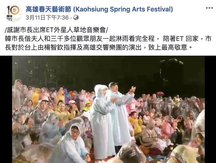 綜合媒體報導,「高雄春天藝術節」10 日在雨中舉辦草地音樂會,韓國瑜與夫人李佳芬也到場參與。高雄春天藝術節官方臉書事後在臉書上 PO 文,內文感謝市長的出席,並表示「韓國瑜偕夫人與現場 3000 多位觀眾一起淋雨看完全程!」豈料卻遭網友湧入留言砲轟:「不僅遲到還作秀!」、「遲到進場還帶一堆記者進來」、「超級沒禮貌的市長」、「真的想念花媽了...」、「3/10 我在現場,中場休息上完廁所走出來,看到你(韓國瑜)做完秀後,就在我面前快閃溜了,是哪一隻眼睛看到他待完全程?」、「明明遲到很晚進場,再來淋雨作秀...沒看到你周圍那些觀眾滿臉混怒(憤怒)表情嗎?!」