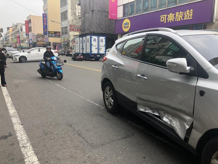 ▲一台白色客車從騎樓倒車到直接撞上2台機車、1台休旅車及1台貨車,2騎士受傷送醫,事故現場一片凌亂。(圖/記者陳雅芳攝,2019.03.18)