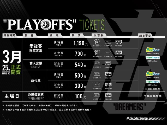經歷過上賽季的挫折,球迷們始終不離不棄,夢想家透過種種努力從1勝19敗的球隊蛻變成19勝7敗的奪冠黑馬,球團用行動回饋並感謝一路以來支持夢想家的球迷,官方購物網站率先在3月中推出商品優惠,而季後賽門票也維持售價不漲價,今日中午12:00將在全家開賣,票種有單人票(一樓500元、二樓300元)、雙人套票(二樓540元)及季後賽限定套票含PLAYOFFS限定短Tee(一樓1190元、二樓790元),不同例行賽的是接駁服務將全面開啟,不論一樓、二樓的球迷都能享有彰化火車站-夢想主場館來回接駁,讓每位來看球的球迷通勤沒煩惱!更多資訊請球迷鎖定寶島夢想家官方粉絲團。