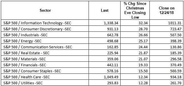 由於美股在 12 月的消退後觸底反彈,所有主要類股均上漲兩位數,科技類股漲幅為 32%。金融股落後,在 11 個類股中排名第八,僅反彈 19%。醫療保健和公用事業最低,雙雙都只有 12% 左右。