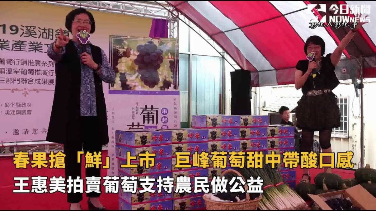春果搶「鮮」上市、秒殺!彰化縣溪湖鎮農會27日辦理溪湖鎮溫室葡萄推廣行銷活動,彰化縣長王惠美化身「叫賣姐」,30盒的巨峰葡萄每盒賣到2.500元,叫賣功力讓人咋舌,拍賣所得將捐給喜樂保育院作公益使用,王惠美說,巨峰葡萄甜中帶酸口感,不易被進口葡萄取代。