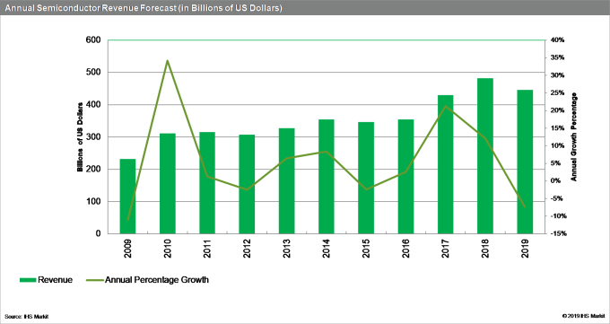 研究公司 IHS Markit 統計指出,全球晶片產業銷售額預計將在 2019 年收縮 7.4% 至 4462 億美元,低於 2018 年的 4820 億美元。該公司表示,這比去年 12 月成長 2.9% 的預測值逆轉 10 個百分點,並讓晶片產業出現 2009 年經濟衰退高峰以來最糟糕的一年,當時晶片銷售下跌 11%。