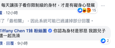 下面也有網友留言說:「每天讓孩子看你限制級的身材,才是有礙身心發展。」T妹也回應:「你認為身材是邪惡,我跟兒子還一起洗澡。」更表示,「奶對我來說,就是哺乳!也是美觀的地方」,更說自己在臉書放的照片,是被官方核准的,根本沒有過度裸露,「說真的,看到奶驚慌的人,大眾認為是有心病。」