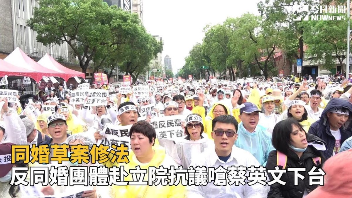 1124公投綁大選反同婚公投三案都通過,但是行政院仍將修同婚專法,引發反同團體不滿。反同婚團體今(8)日在立法院前抗議,大喊「違反民意、小英下台」,呼籲總統與立委要尊重公投結果,不應該當不尊重民意的極權國家。