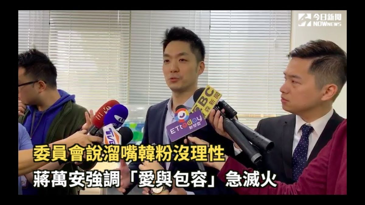 國民黨團今早在內政委員會杯葛公投法修法,但在杯葛的過程中,出現比兩黨互相批評更精采的插曲,在上午約10點20分,藍綠火力稍歇時,國民黨立委們各自開始閒聊,立委李彥秀跟蔣萬安各自交換選區民情時,蔣萬安脫口說出,「其實支持韓國瑜都是比較沒理性的,就是他(韓粉)也說不出來為什麼支持他(韓)」,影片被立法院測錄系統錄下,蔣出面強調愛與包容,急忙滅火。
