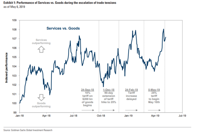高盛分析師為強調他們的觀點,特別提供一張圖表,顯示在美中貿易緊張局勢升級期間,服務型個股與商品型個股的相對表現: