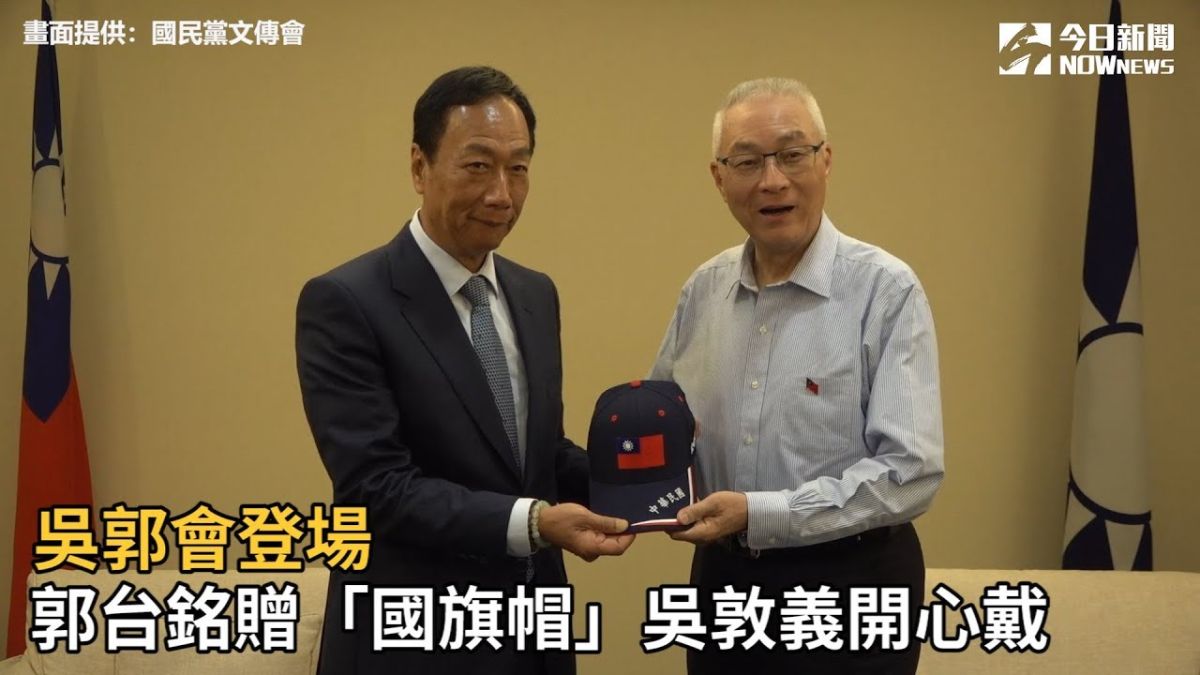 吳郭會今(13)日上午10時在國民黨中央黨部登場,鴻海董事長郭台銘特地致贈黨主席吳敦義一頂「中華民國國旗帽」,吳敦義當場戴上,兩人還合拍一張相片留念。 我是廣告 請繼續往下閱讀 郭台銘進入會場前受訪表示,自己準備了一些手稿,將念給國民黨主席吳敦義聽,他並特地準備一頂有中華民國國旗的鴨舌帽,送給吳敦義當伴手禮。 吳郭會13日登場,鴻海董事長郭台銘特地致贈黨主席吳敦義一頂「中華民國國旗帽」。(圖 / 國民黨提供 ) 相關新聞 正妹議員開嗆郭台銘!「照顧年輕人請用點心拿出真本事」郭台銘緊握「美女記者」手 財經台洪珮瑜一夕爆紅郭台銘母親節在外霸氣在家暖男 曾馨瑩也認證的鐵漢柔情 吳敦義郭台銘吳郭會