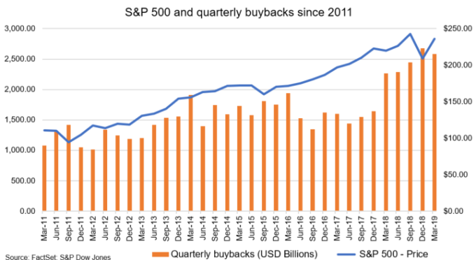 Ned Davis Research 編製的數據顯示,如果美股企業沒有執行庫藏股回購,標準普爾 500 指數估將較目前水準再低 19%。該公司研究了標準普爾 500 指數在 2011 年第 1 季和 2019 年前 3 個月之間的表現,然後再減去每月淨回購量,得出上述結論。在這段時期內美股大盤上漲超過 125%,而淨回購總額約為 3.5 兆美元。