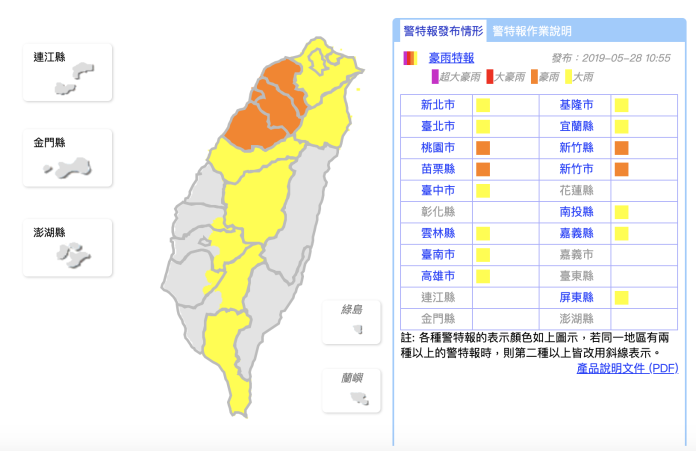 氣象局表示,今( 28 )日鋒面通過及對流雲系發展旺盛,易有短時強降雨,上午 10 時 55 分將桃園市、新竹市、新竹縣及苗栗縣警示升級為豪雨特報,有局部大雨或豪雨發生的機率。