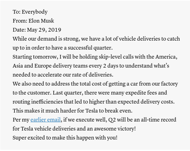 特斯拉 (TSLA-US) 執行長馬斯克又向全員工喊話了,這一次他要求員工在季末衝刺交車量,除了要締造歷史,還要控制成本。