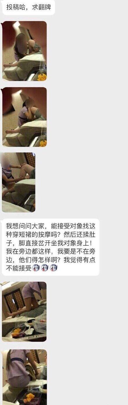 許多人常常會上按摩店,就是希望能讓自己全身放鬆,日前大陸網上有一名女網友以「能接受對象找這種穿短裙的按摩嗎?」發問,並貼出女技師火辣穿著照片,直言按摩師穿著火辣,更「超貼身服務」自己的男友,讓她心裡超不滿!