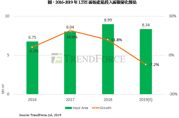 集邦 (TrendForce) 光電研究 (WitsView) 表示,原先預期今年 LTPS 機種需求將穩定成長,帶動 LTPS 產線稼動率持續攀升,但受華為禁令影響,估 LTPS 產線投入面積將從第 3 季開始減少,全年可能下滑 7.2% ,僅約 8.3 百萬平方公尺,將是近年首次面臨衰退風險。