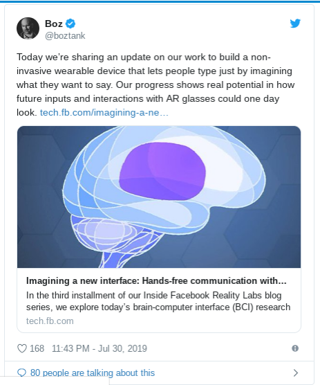 臉書 AR/VR 部門副總裁 Andrew Bosworth (Boz) 表示,「今天我們分享我們打造非侵入式可穿戴設備的工作一些進展,該設備可讓大眾用意念想像就能打出他們想說的話。我們的進展顯示,未來將可見到對於 AR 眼鏡的投入和互動的真實潛力。」