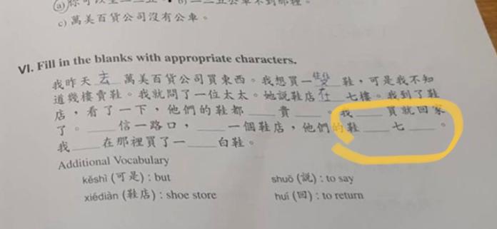 題目全文『我昨天「去」OO百貨公司買束西,我想買一「雙」鞋,可是我不知道幾樓賣鞋。我就問了一位太太,她說鞋店「在」七樓。我到了鞋店,看了一下,他們的鞋都「_」貴「_」,我「_」買就回家了。「_」XX路口,「_」一個鞋店,他們的鞋「_」七「_」,我「_」在那裡買了一「_」白鞋。』其中『他們的鞋「_」七「_」』這一段便是外國朋友相當苦惱的地方。