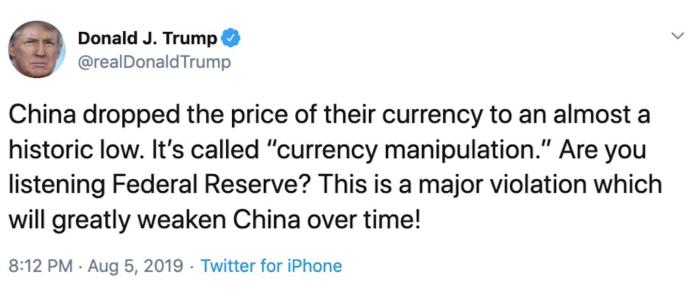 綜合媒體報導,川普今天在推特上 PO 文痛批:「中國將他們的貨幣價格降至接近歷史最低,這種行為就叫『貨幣操縱』!」他更喊話聯準會(Fed):「你們看見了嗎?這是重大的違規行動,且隨著時間過去,將會大大削弱中國(貨幣)!」