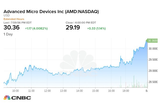 AMD 週三收高 1.1%,盤後大漲 4% 以上,暫報 30.36 美元。