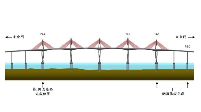 金門大橋工程後續施工重點為海中鋼箱圍堰基礎施工,目前施工團隊已克服海水浮力及海流衝擊力等影響,成功下放主橋P48、P50墩位之基礎鋼套箱,P48並於108年7月27日完成樁帽基礎2,568立方公尺混凝土澆置,P50也於108年8月8日完成樁帽基礎1,108立方公尺混凝土澆置,金烈水道2座橋墩己露出海面,後續深槽區9座橋墩柱將如雨後春筍挺進天際。