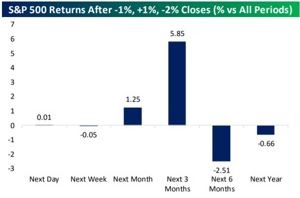 標準普爾 500 指數週一 (12 日) 下跌 1.2%,隨後在下一交易日反彈 1.5%,週三 (14 日) 更因債市出現衰退訊號而重挫 2.9%。標普 500 指數這種連續上下震盪的走勢:下跌 1%、上漲 1%、下跌 2%,在歷史上非常罕見,根據 Bespoke Investment Group 的統計,追溯至 1928 年,在出現這種現象後的 6 個月內平均下跌 2.5%。