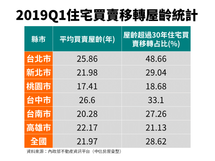 根據內政部統計,今年第一季全國住宅買賣移轉平均屋齡為21.97年,而六都分別為台北市25.86年、新北市21.98年、桃園市17.41年、台中市26.6年、台南市20.28年、高雄市22.17年。