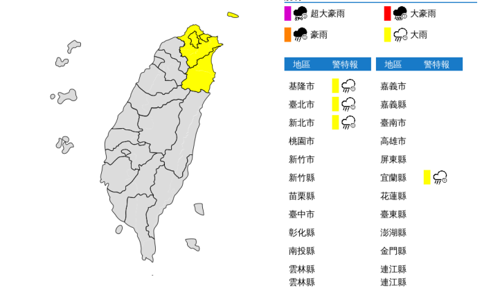 氣象局表示,今( 4 )日高雄市已有豪雨發生,受到玲玲颱風外圍環流影響,今晚至明日大台北及東北部地區仍有局部大雨發生的機率,明晨南部沿海易有局部較大雨勢,提醒民眾注意。 我是廣告 請繼續往下閱讀 ▲受到玲玲颱風外圍環流影響,氣象局針對北北基宜發布大雨特報。(圖/中央氣象局)× ▲受到玲玲颱風外圍環流影響,氣象局針對北北基宜發布大雨特報。(圖/中央氣象局) 相關新聞 為何「個人薪資」不能分享?男女論戰揭1關鍵:不是愛比30歲男想轉行房仲!過來人曝「經驗談」:等於放手一搏病毒定序再新增!空服員與機師同感染源「傾向本土個案」 大雨特報下雨颱風氣象局玲玲