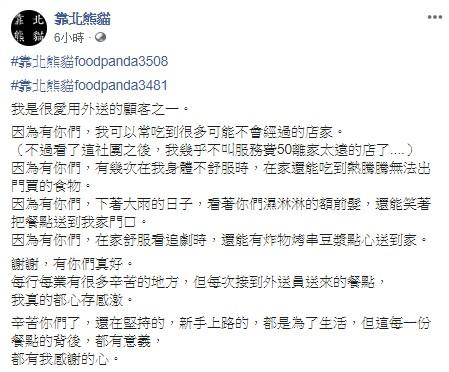 ▲網友道謝外送員全文。(圖/取自靠北熊貓臉書)