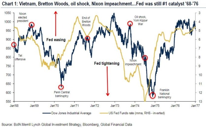 美銀美林在一份研報中舉例,1968 年至 1976 年間美國歷史特別動盪的那段時期,其中包括越南戰爭、布雷頓森林體系貨幣體系的終結、石油危機以及美國總統理尼克森 (Richard Nixon) 的彈劾案,Fed 都在其中扮演了重要要角。
