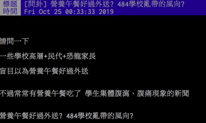原 PO 表示「一些學校高層 + 民代 + 恐龍家長,盲目以為營養午餐好過外送,不過常常有營養午餐吃了 學生集體腹瀉、腹痛現象的新聞,營養午餐好過外送?是不是學校亂帶的風向?」
