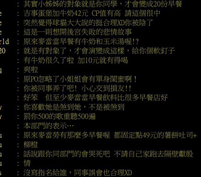 在煩悶的上班日裡,免不了與辦公室同事一起訂餐、訂飲料,享受日常生活的小確幸,日前有網友在PTT上分享自己的糗事,為了跟心儀的女同事搭訕,於是霸氣的寫了張紙條給對方,「明天早餐想吃麥當勞嗎?想吃就寫!我處理」,沒想到一早竟收到寫了20份早餐的清單,讓原PO當場傻眼硬著頭皮全部去買回來,後來結局更是神展開,引起網友熱議回覆,但也釣出內行網友分享CP值很高的早餐組合。
