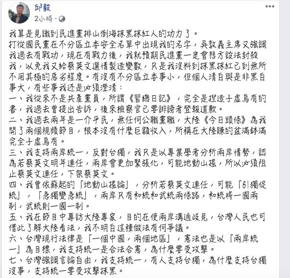 國民黨 13 日曝光不分區提名名單,其中黨主席吳敦義從原本傳出的第 8 名移至第 10 名,而第 8 名則為前立委邱毅,被外界視為大黑馬,但網友們不買單,一路狂轟邱毅是「賣國賊」,甚至起底今年 10 月 1 日中國國慶,在微博祝賀的貼文。對此,邱毅沈默一天後,今( 14 )日在臉書回應,我支持統一,有人支持台獨,為什麼支持台獨沒事,支持統一要受攻擊抹黑。