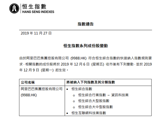 恆生公司表示,由於阿里巴符合恆生綜合指數「快速納入指數規則」之要求,故同意阿里巴巴納入該指數,而相關指數的成份股將於 2019 年 12 月 6 日收盤後變動,並於 2019 年 12 月 9 日起正式生效。