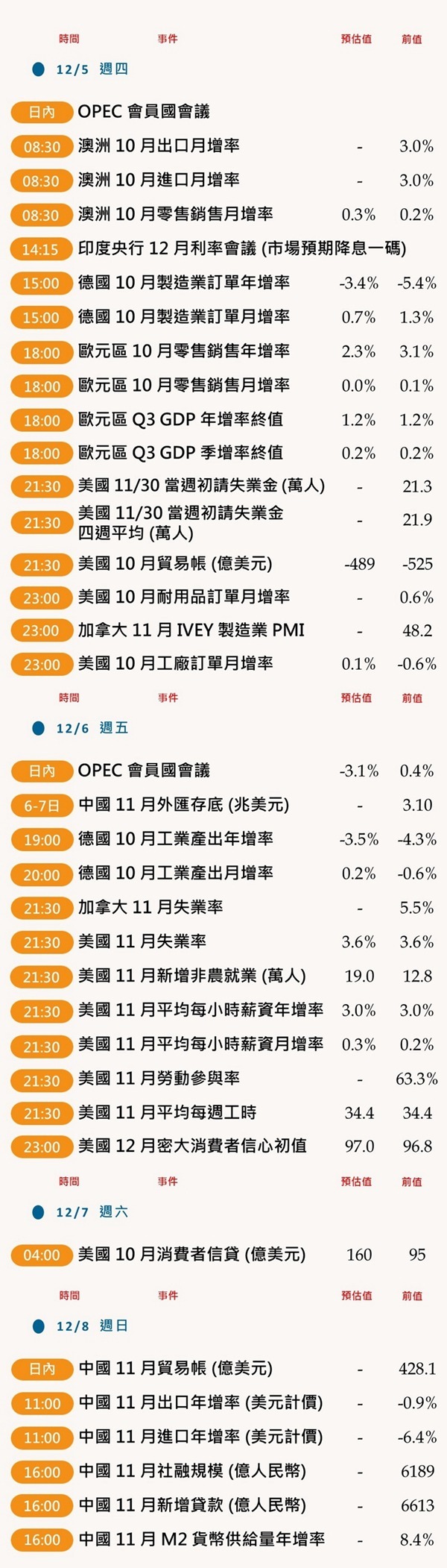 週四 (5 日) 印度央行將召開 12 月利率會議,市場預期,印度央行將降息一碼至 4.90%,以支持印度經濟、緩解景氣放緩之陰霾。