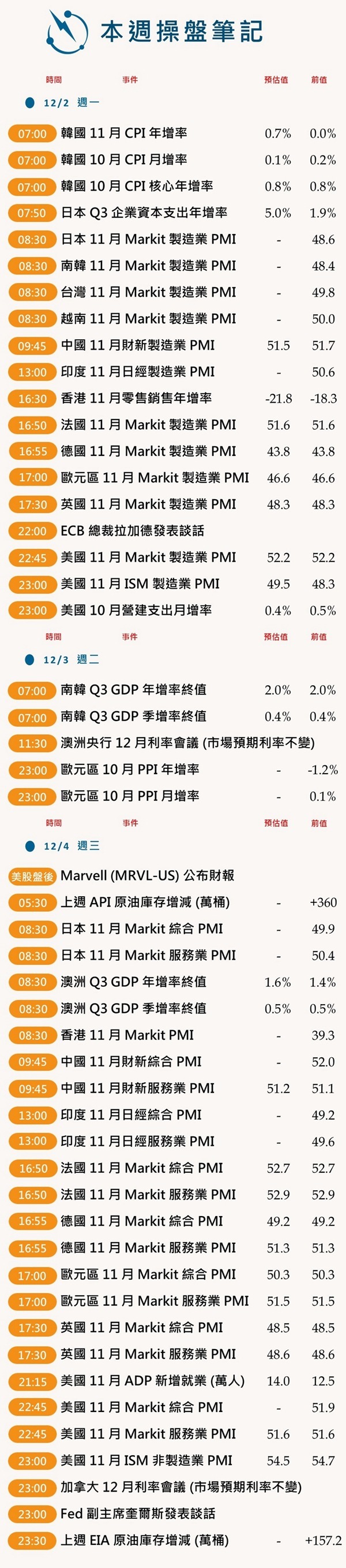 本週全球主要國家將公布 11 月製造業 PMI 終值,其中市場最為關注美國 ISM 製造業 PMI 之復甦狀況,因目前美國 ISM 製造業 PMI 仍低於 50 的景氣分水線。